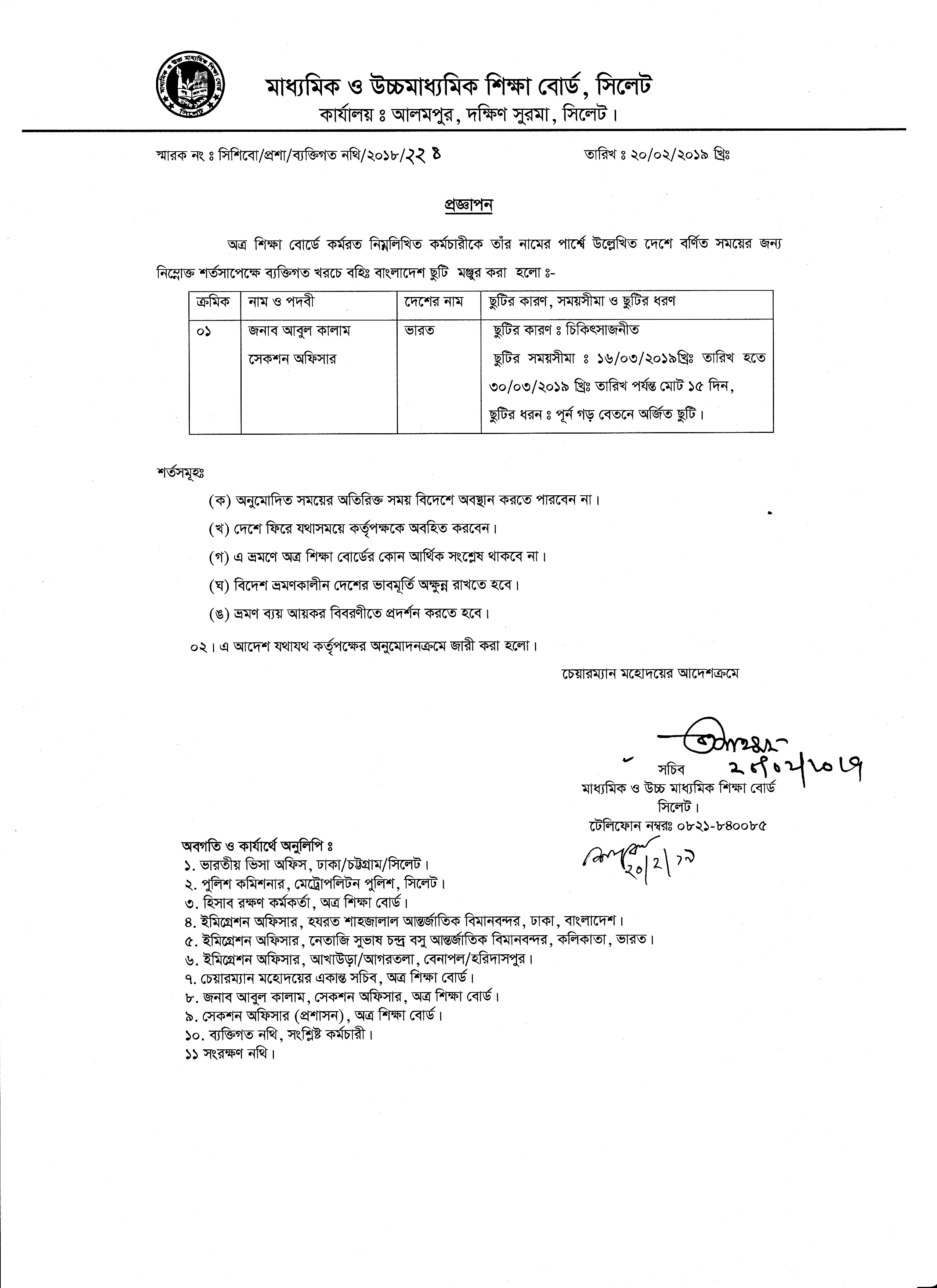 Order of ex-Bangladesh leave (GO) for Md Alamgir Kabir.